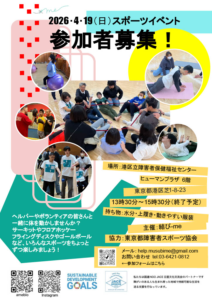 結 び - m e で は 、 障 が い の あ る 方 と 結 び め ヘ ル パ ー の お 手 伝 い と し て 一 緒 に 楽 し く 過 ご し て い た だ け る 方 を 大 募 集 し て い ます